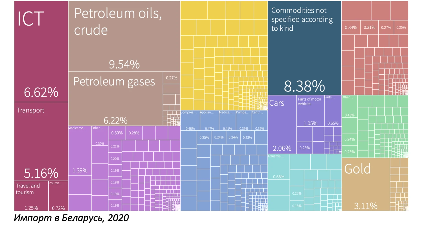 - Энергоносители: Беларусь сильно зависит от импорта нефти и газа, в основном из России, для обеспечения своих энергетических потребностей и поддержания работы отраслей, таких как нефтехимическая и нефтеперерабатывающая промышленность.