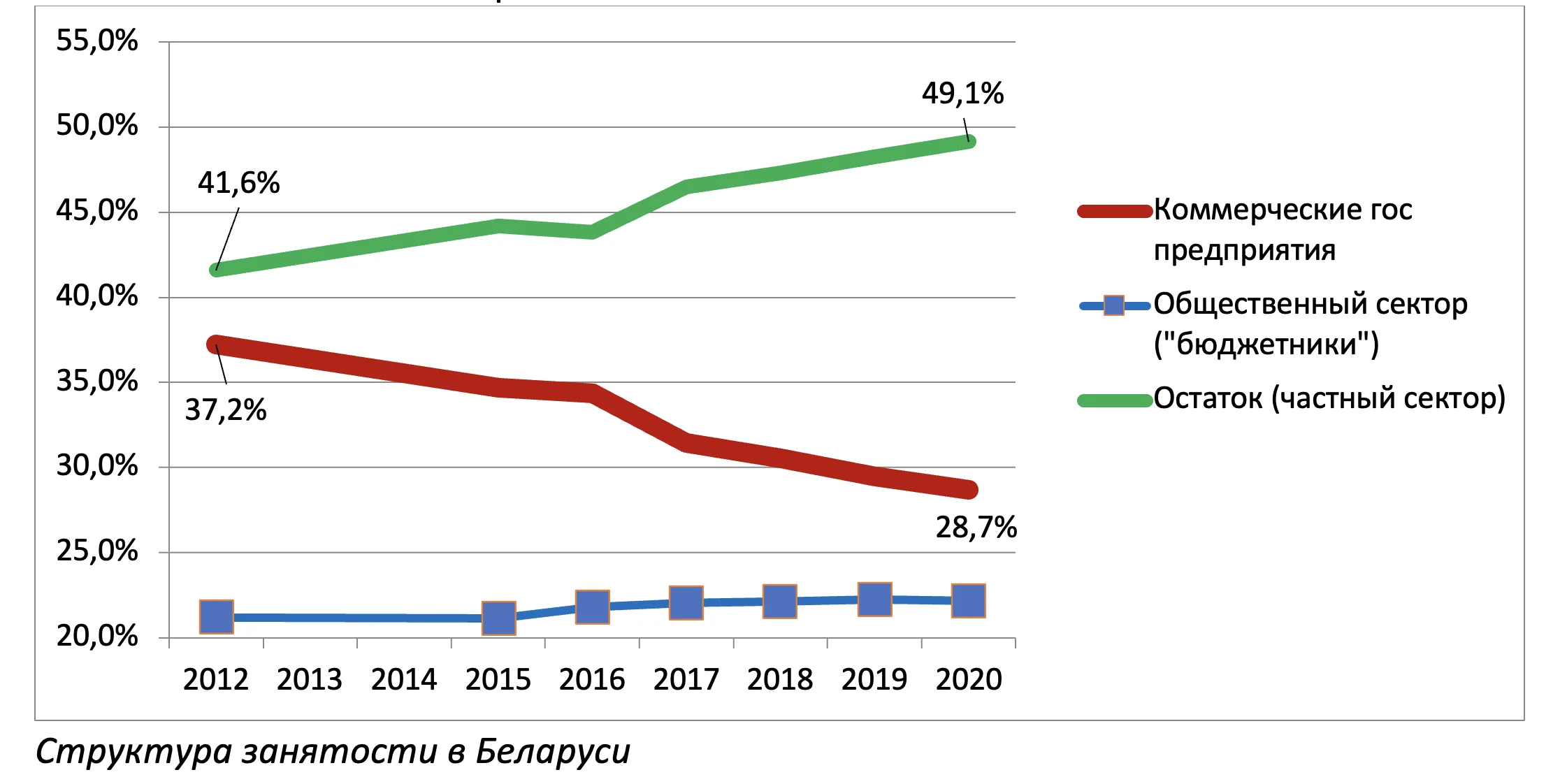 В Беларуси отсутствует значительная приватизация коммерческих предприятий, что приводит к увеличению доли государственного сектора в экономике. В 2012 году 37.2% рабочей силы были заняты в госсекторе, а в 2020 году этот показатель снизился до 28.7%. Сокращение занятости в госсекторе обусловлено выходом работников на пенсию и ростом частного сектора. Занятость в частном секторе увеличилась с 41.6% в 2012 году до 49.1% в 2020 году. Данные тенденции указывают на изменение структуры занятости и экономики Беларуси в целом. Однако, по-прежнему, большой государственный сектор может сдерживать инновации, конкуренцию и эффективность экономики. Это также может влиять на внешнюю политику страны, поскольку государственные компании могут быть более подвержены политическим воздействиям и внешним санкциям.