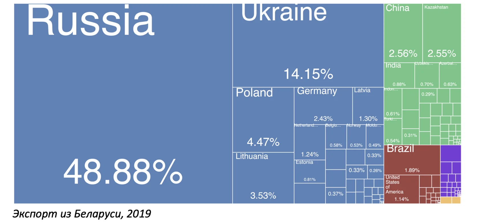 Естественными экономическими партнерами Беларуси были бы ЕС и Россия, но в силу различных факторов Россия доминировала даже до начала войны и ввода основных санкций. Исторические причины и отсутствие реформ привели к росту зависимости от России. Санкции только усилили ее.
