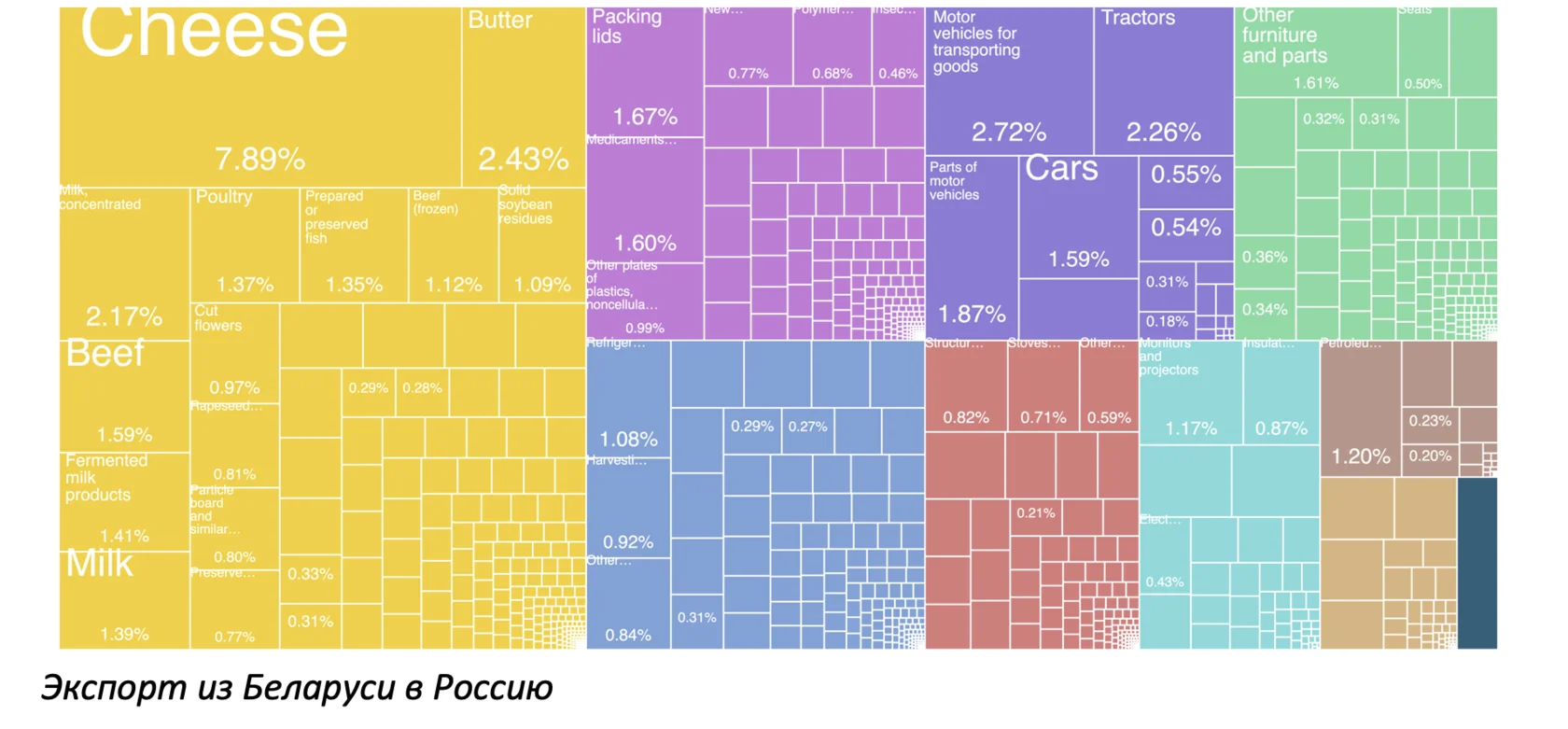 Экспорт Беларуси в Россию включает в себя товары с высокой добавленной стоимостью, которые часто производятся государственными предприятиями. Некоторые из ключевых секторов обрабатывающей промышленности, экспортирующих в Россию, включают: